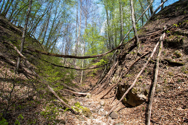 Túránkat ezúttal a Holdvilág-árok romantikus patakvölgyén át indítottuk. Rögtön a bejáratnál kávé és limonádé kínálta magát egy kapu előtti asztalon. Örömmel csaptunk le a lehetőségre, hálát adva a jószívű gazdának. Leperkáltuk a becsületkasszába a jelzett összeget, s nekivágtunk a napos, madárcsicsergős illatos erdőnek. Hamar elértük a Meteror létrát, felmásztunk, majd a a létra fölött megnéztük az ásatási helyszínt is. Innen a Lajos-forrás felé vettük az utat, majd egy hirtelen ötlettől vezérelve javasoltam, hogy inkább célozzuk meg a Salabasina-árkot, ahol reményeim szerint ilyenkor senki sem jár, illetve a kidőlt fákon és sziklatömbökön való átjutás igazi kalandtúrává változtathatja kirándulásunkat.