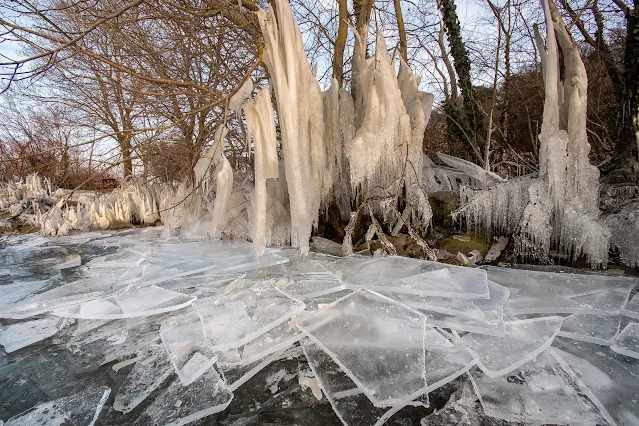 A kezdeti fagyos idő után a vékony jégréteget viharos erejű szél sodorta a part felé, méteres jégtáblákká szabdalva azokat. A part mentén a jégtáblákat szinte függőleges irányba fordította és egymáshoz préselte a vihar. Esetleg a vízszinttel párhuzamosan csúsztak egymásra és összefagytak. Így a part menti részeken vastag jégréteg keletkezett, amin ugyan járni nehézkes, mivel felületük nem vízszintes, hanem erősen struktúrált, de legalább garantált, hoyg nem szakad be alattad. ott, ahol a távolban sima víztükör mutatkozik valószínűleg nem elég vastag a jég a csúszkáláshoz.