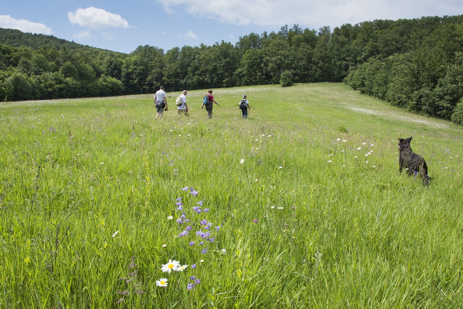 át, bokrok között csúsztunk-másztunk.Kicsit bizonytalan voltam a pontos irányban is, hamarosan azonban csodaszép virágos rétre érkeztünk. Számtalan margaréta és lila virág között átvágva végül a helyes ösvényre is ráleltünk.