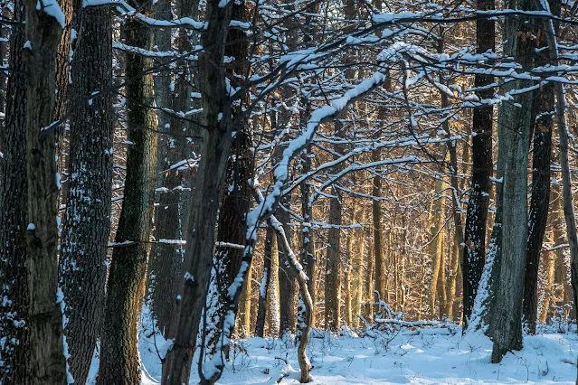 | Ahogy egyre feljebb jutok, a levegő is hűvösebb lesz, a hó erősen kapaszkodik a faágakba. |